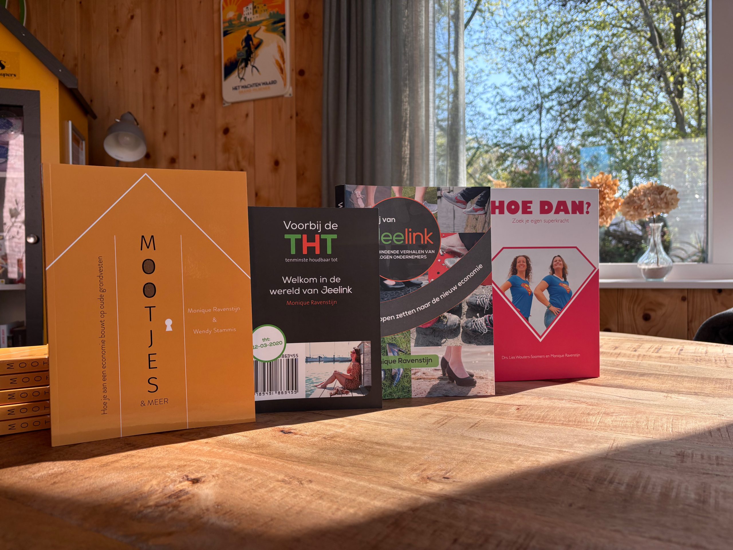 De boeken van Monique Ravenstijn nemen je mee in een wereld waarin verbinding, duurzaamheid en lef centraal staan. In Mootjes & Meer ontdek je hoe kleine initiatieven kunnen uitgroeien tot een beweging die écht impact maakt. Voorbij de THT laat zien hoe we anders kunnen kijken naar onze economie en samenleving, met praktische inzichten vanuit de werkvloer. In Wij van Jeelink staan inspirerende verhalen van bevlogen ondernemers centraal, waarin de kracht van samenwerken voelbaar wordt. En met Hoe dan? zet Monique je aan tot denken én doen: hoe geef jij zelf vorm aan verandering? Vier boeken, één missie: samen bouwen aan een mooiere, socialere en duurzamere wereld.